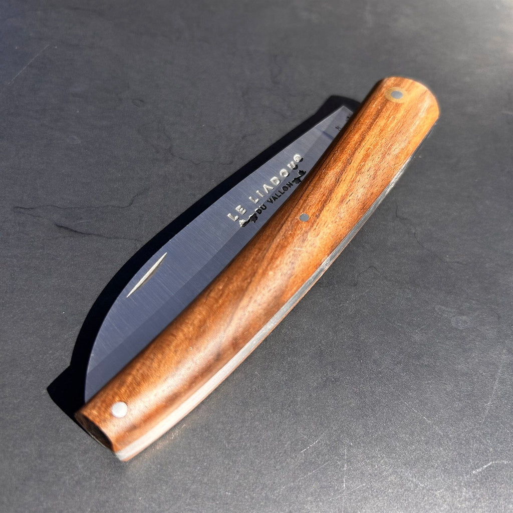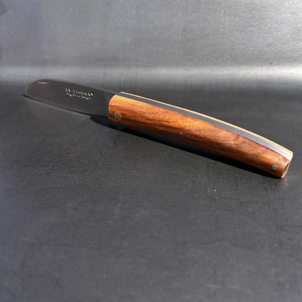 Ce couteau fermant est équipé d'un manche en noyer du Vallon façonné à la main.