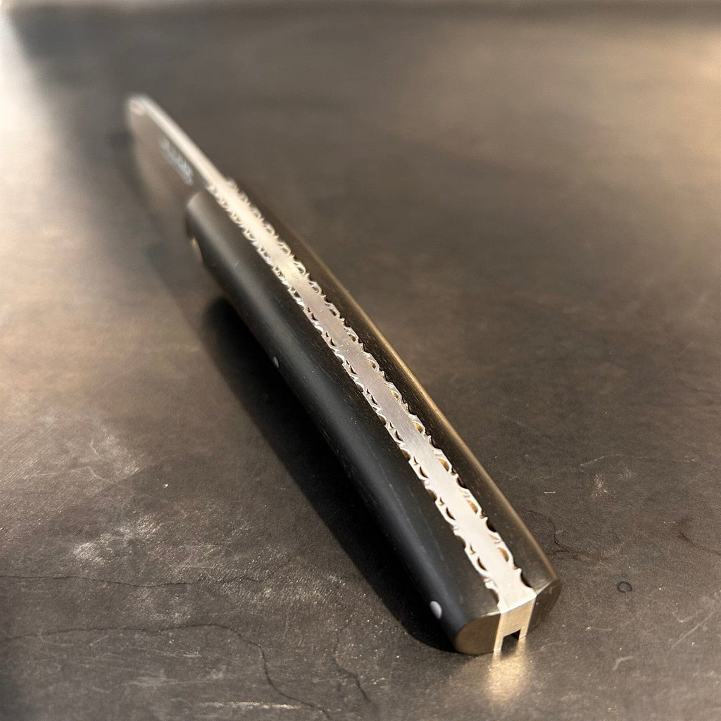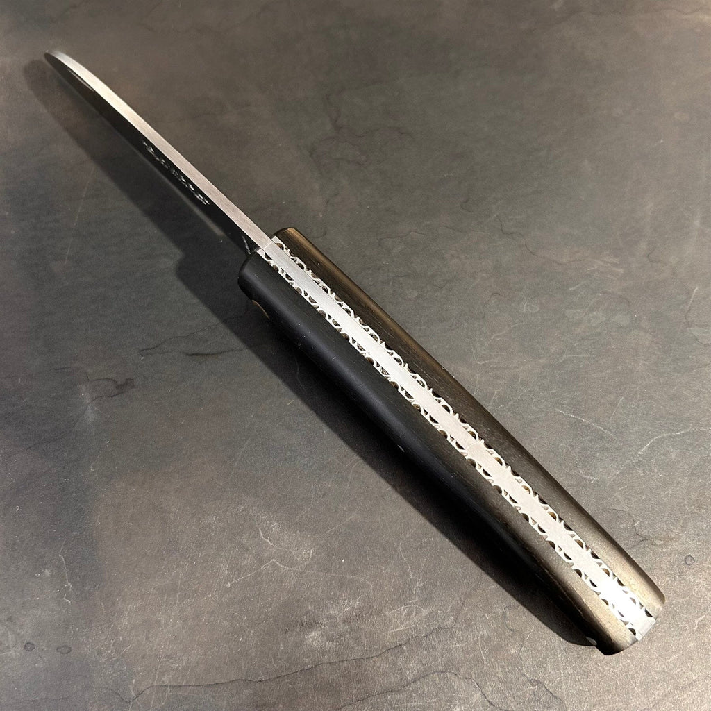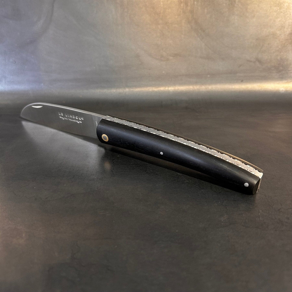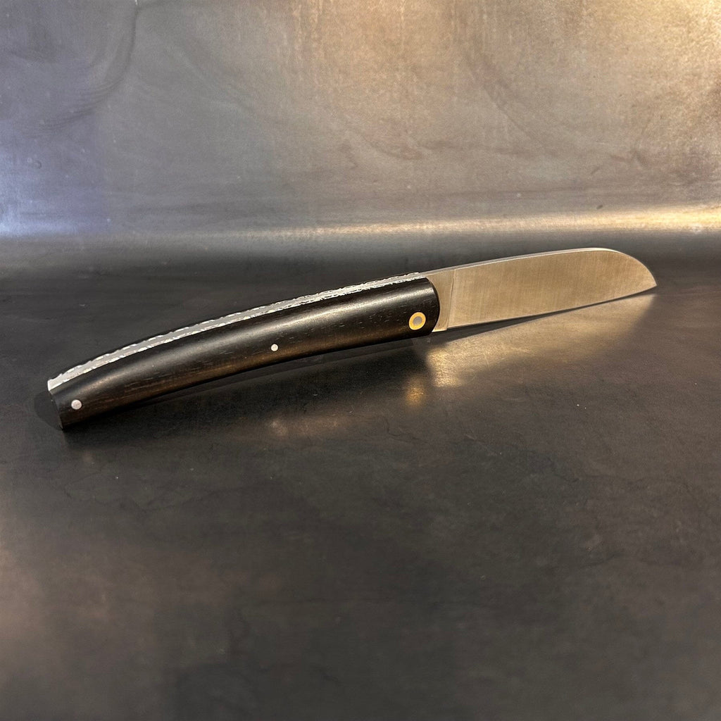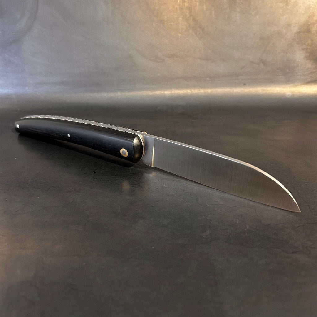 Ce couteau fermant est équipé d'un manche en ébène façonné à la main. Ce bois précieux et dense provient généralement d'Afrique et propose une teinte noire profonde pour une esthétique sobre et élégante. Ses platines sont ciselées à la main. Sa lame est en acier inoxydable Sandvik 14C28 qui combine d'excellentes performances de coupe, une dureté élevée et une très bonne résistance à la corrosion.
