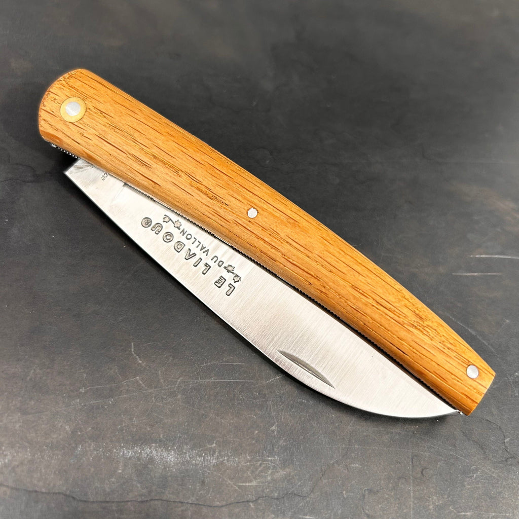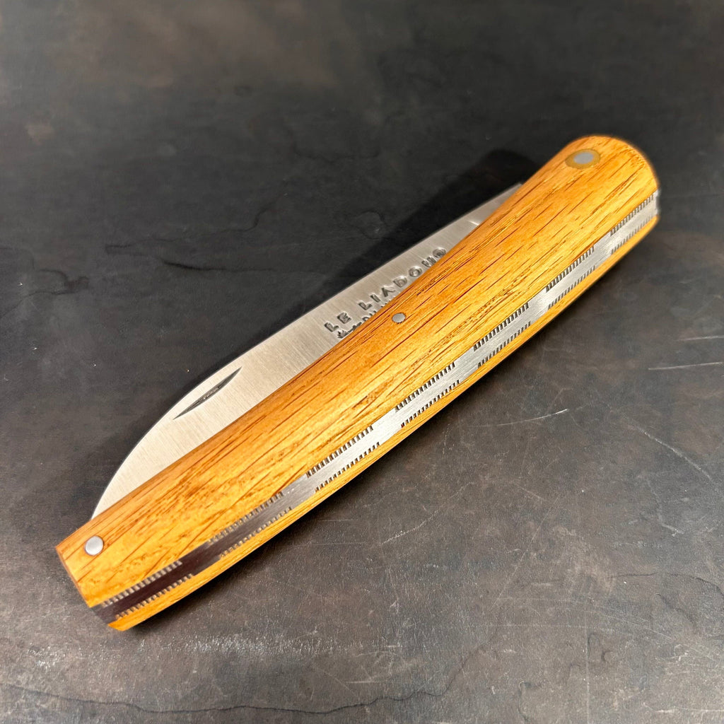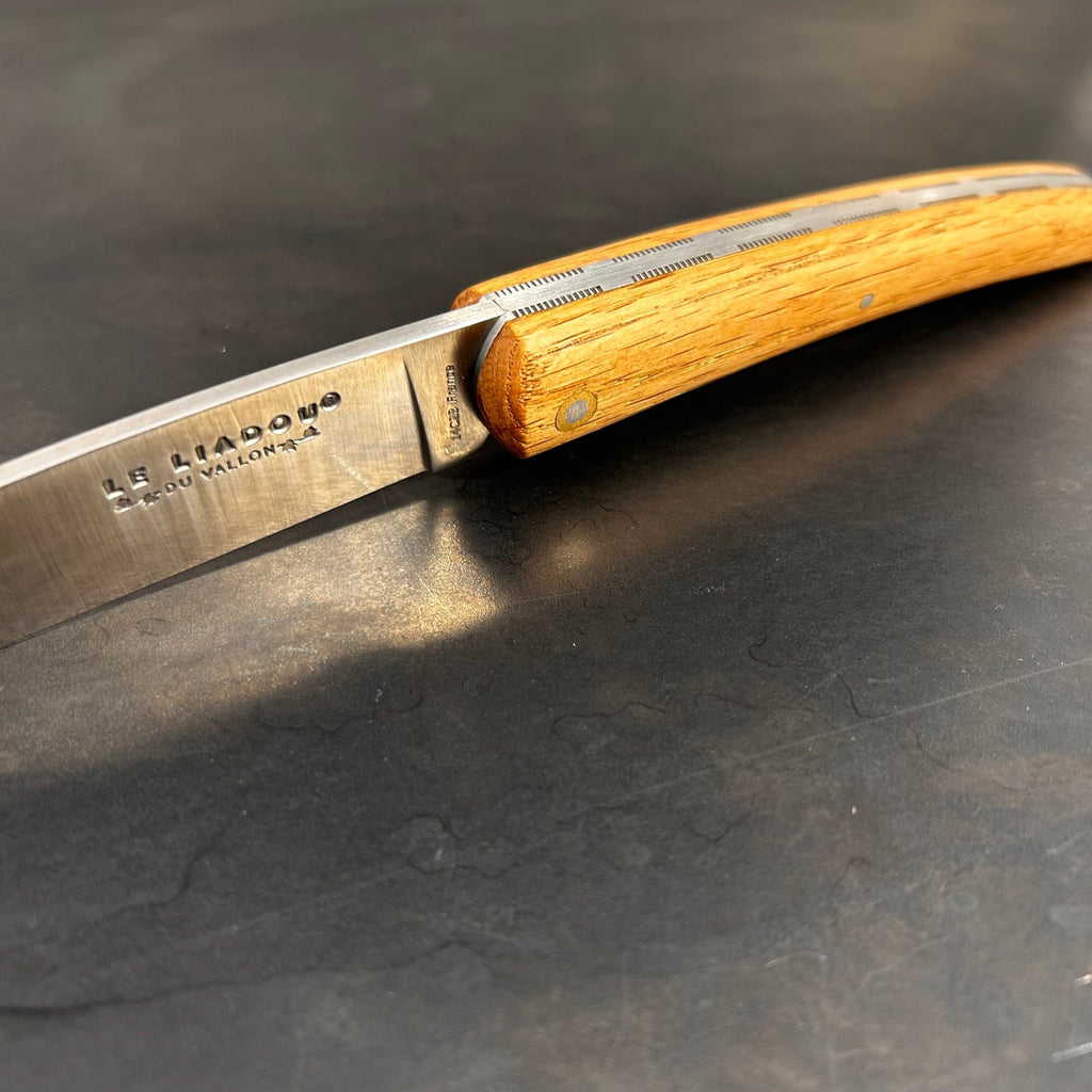 Ce couteau fermant est équipé d'un manche en chêne de foudre façonné à la main. Ce bois noble et dense provient de foudres anciens (très grandes barriques) servant à l'élevage et au stockage du vin. Ses platines sont ciselées à la main. Sa lame est en acier inoxydable Sandvik 14C28 proposant d'excellentes performances de coupe, une dureté élevée et une très bonne résistance à la corrosion.