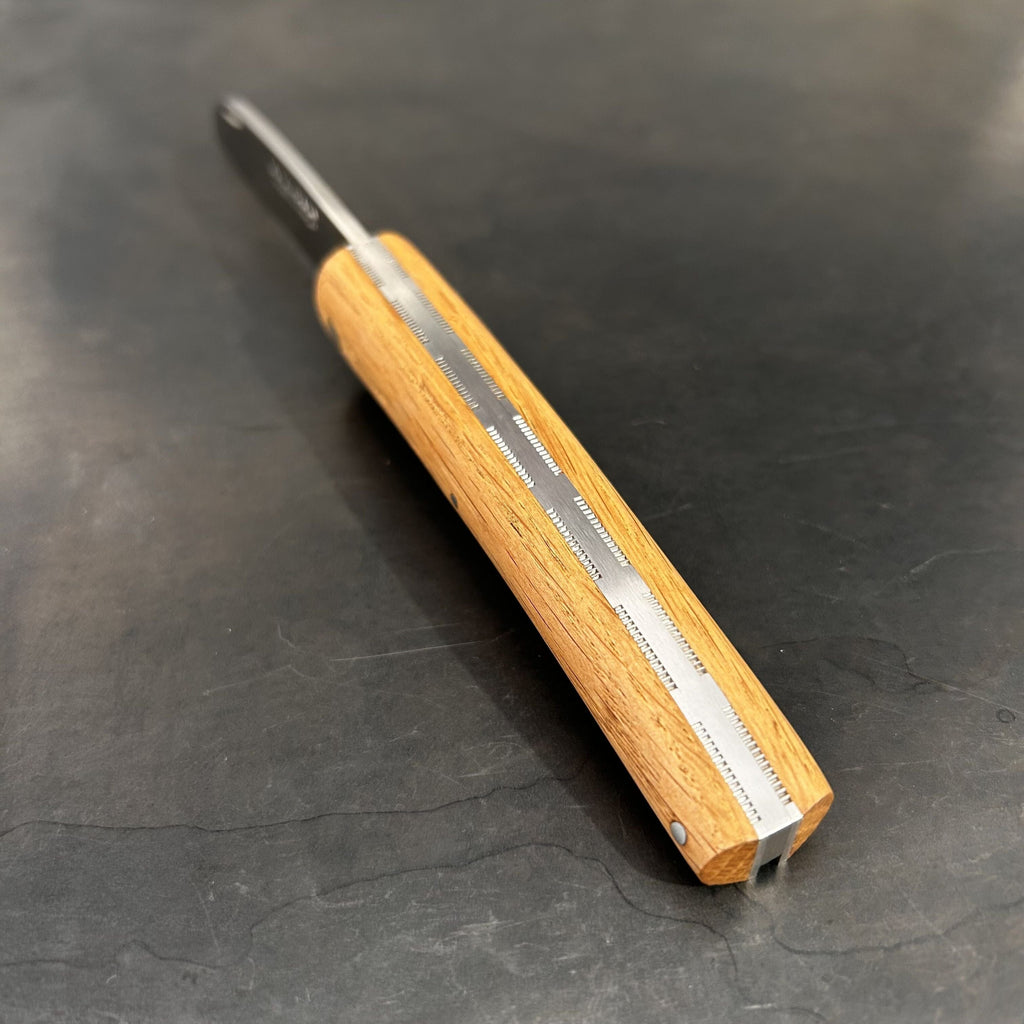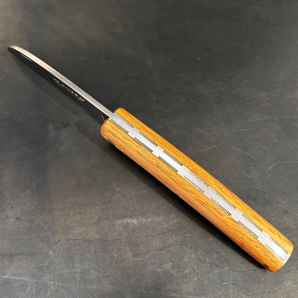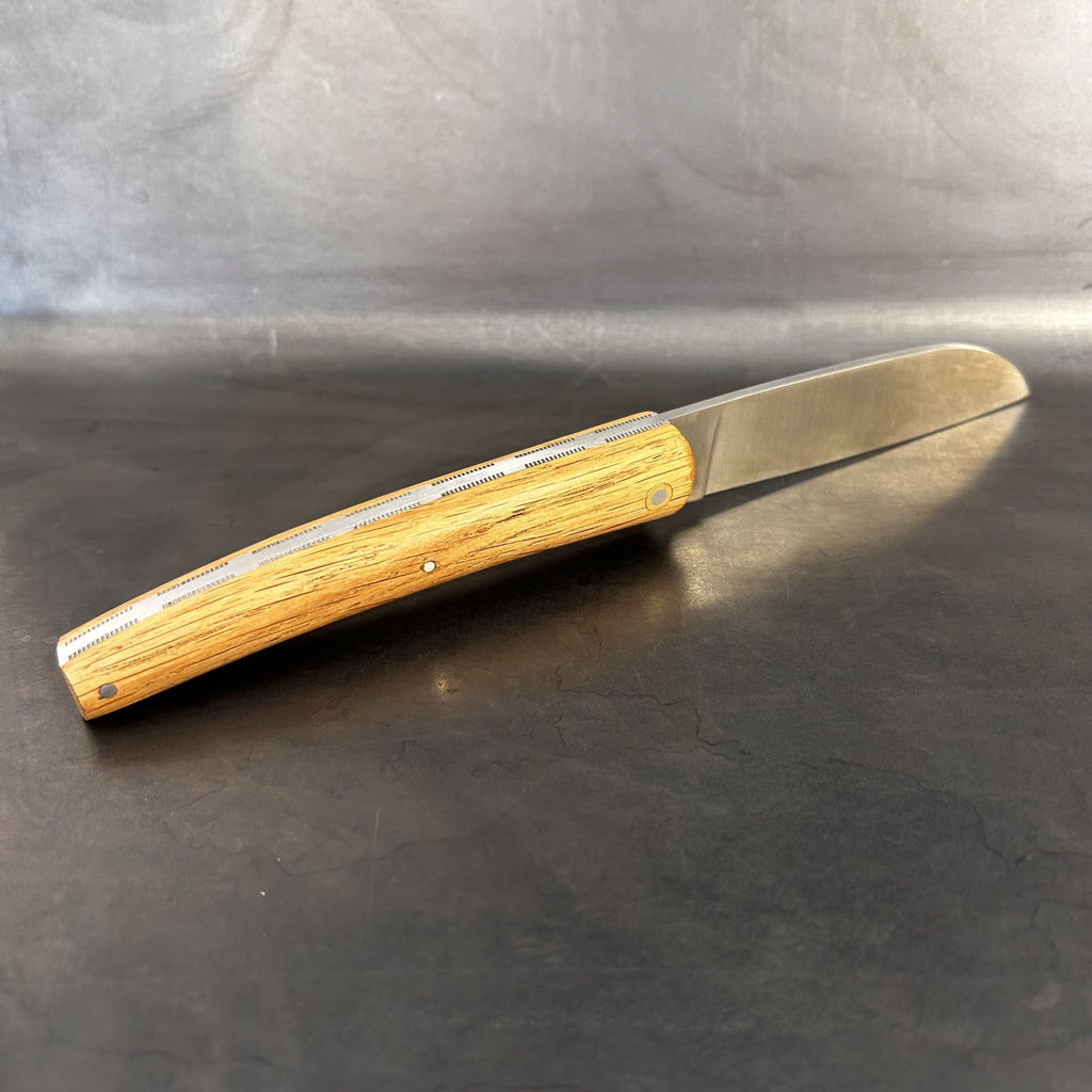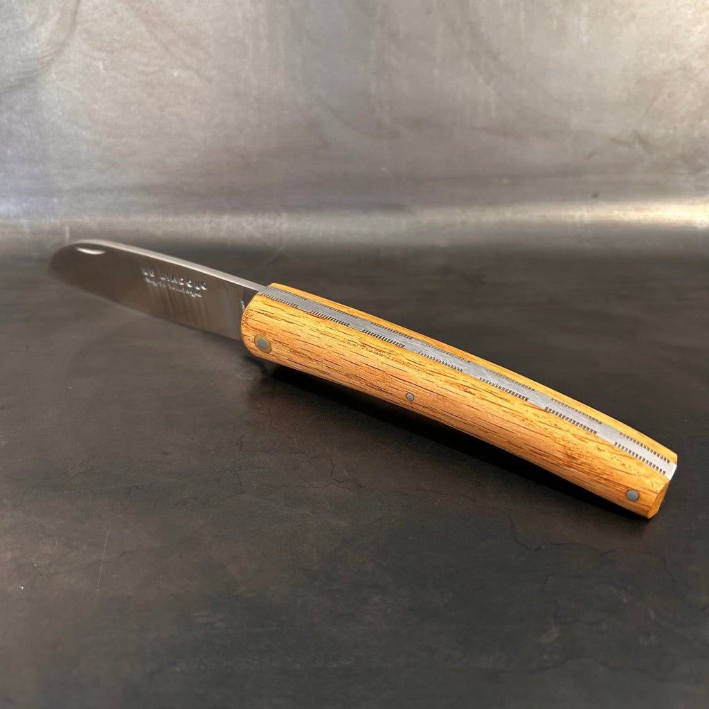 Ce couteau fermant est équipé d'un manche en chêne de foudre façonné à la main. Ce bois noble et dense provient de foudres anciens (très grandes barriques) servant à l'élevage et au stockage du vin. Ses platines sont ciselées à la main. Sa lame est en acier inoxydable Sandvik 14C28 proposant d'excellentes performances de coupe, une dureté élevée et une très bonne résistance à la corrosion.