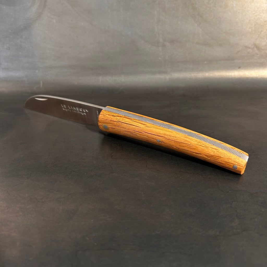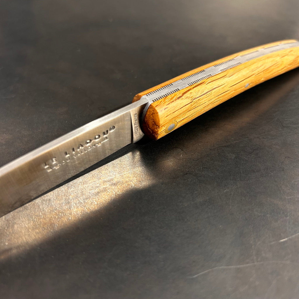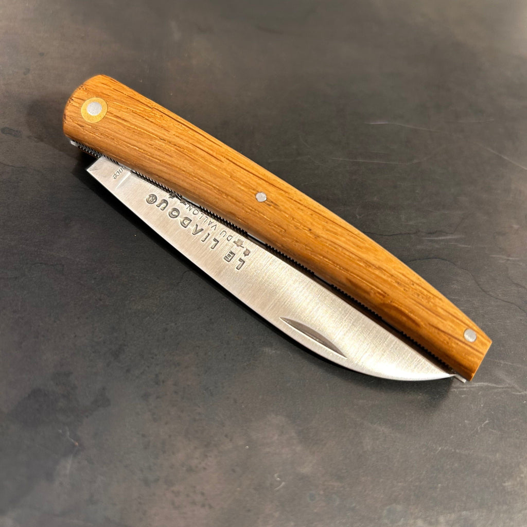 Ce couteau fermant est une version réduite du Liadou® Original. Il est équipé d'un manche en chêne de foudre façonné à la main. Ce bois noble et dense provient de foudres anciens (très grandes barriques) servant à l'élevage et au stockage du vin. Ses platines sont ciselées à la main. Sa lame est en acier Sandvik 14C28 inoxydable présentant performance de coupe, dureté élevée et très bonne résistance à la corrosion.