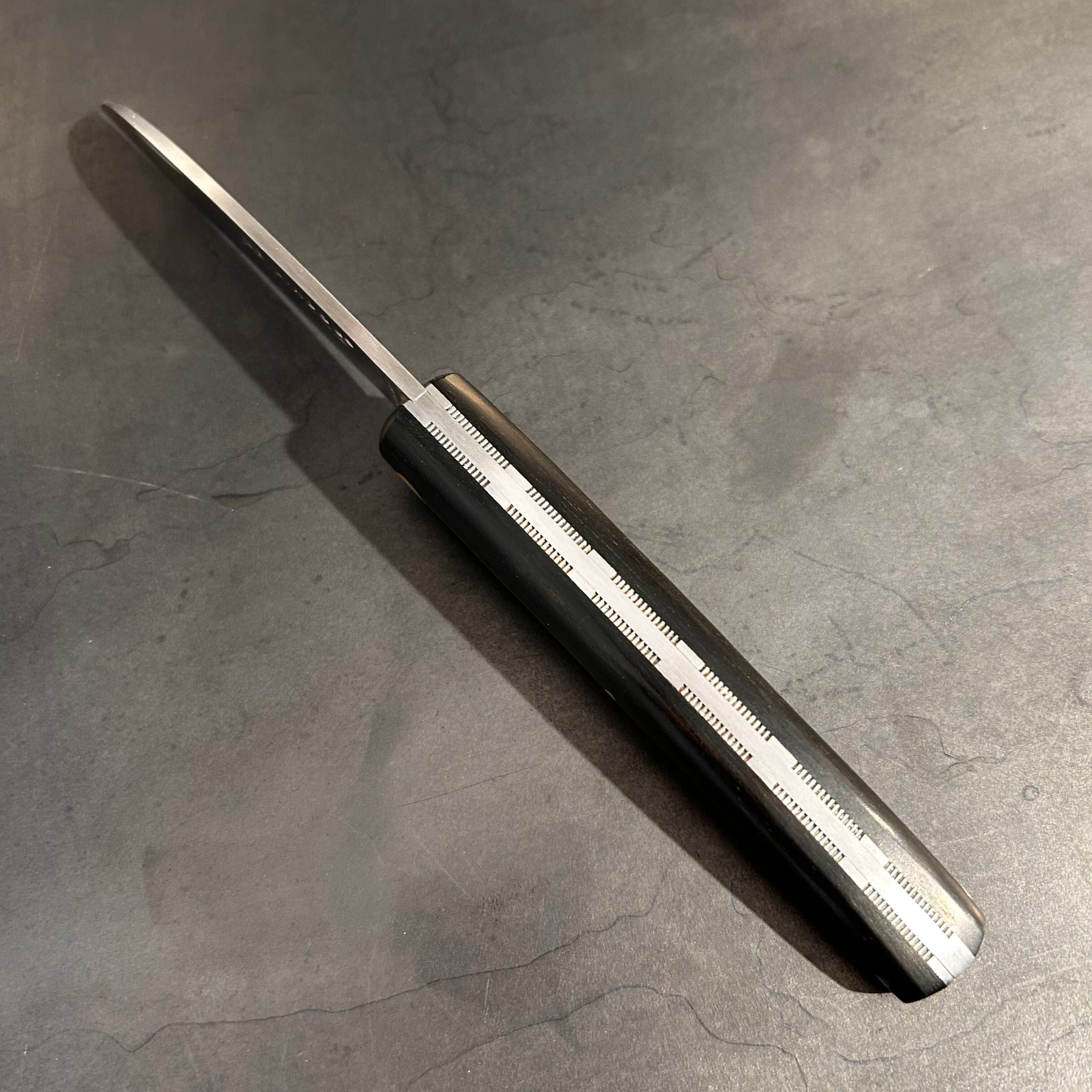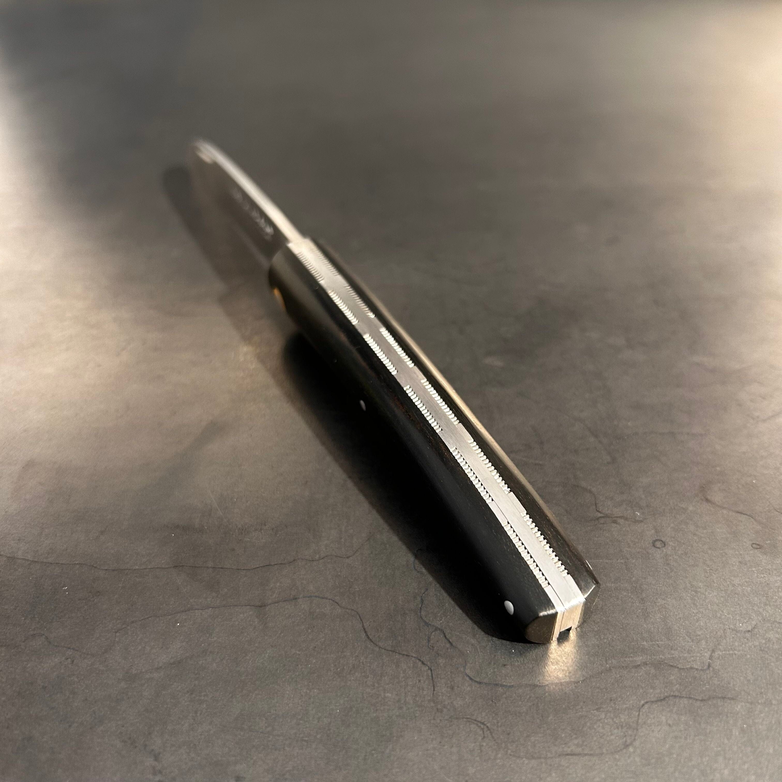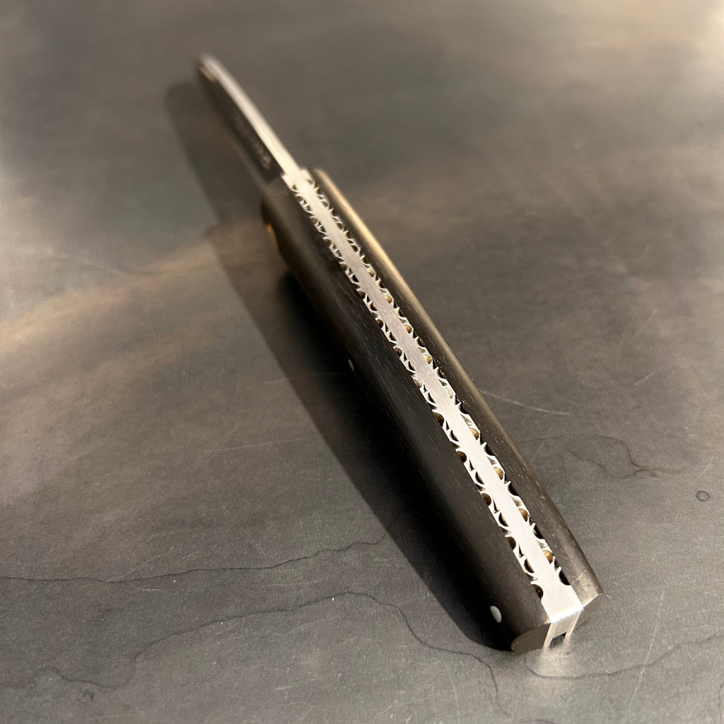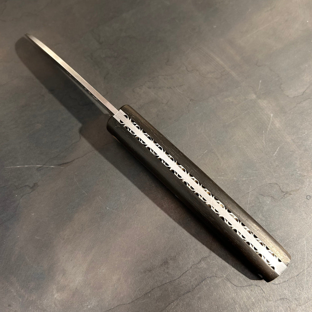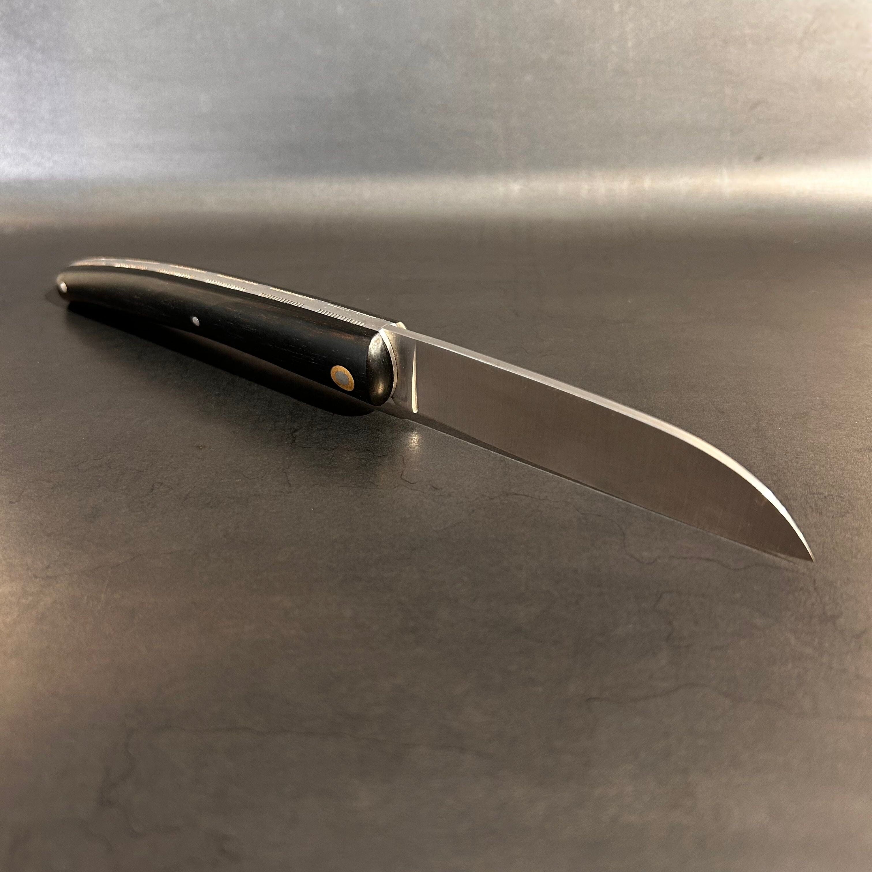 Ce couteau fermant est équipé d'un manche en Ebène façonné à la main. Ses platines sont également ciselées à la main. Sa lame est en acier Sandvik 14C28 inoxydable présentant performance de coupe, dureté élevée et très bonne résistance à la corrosion.