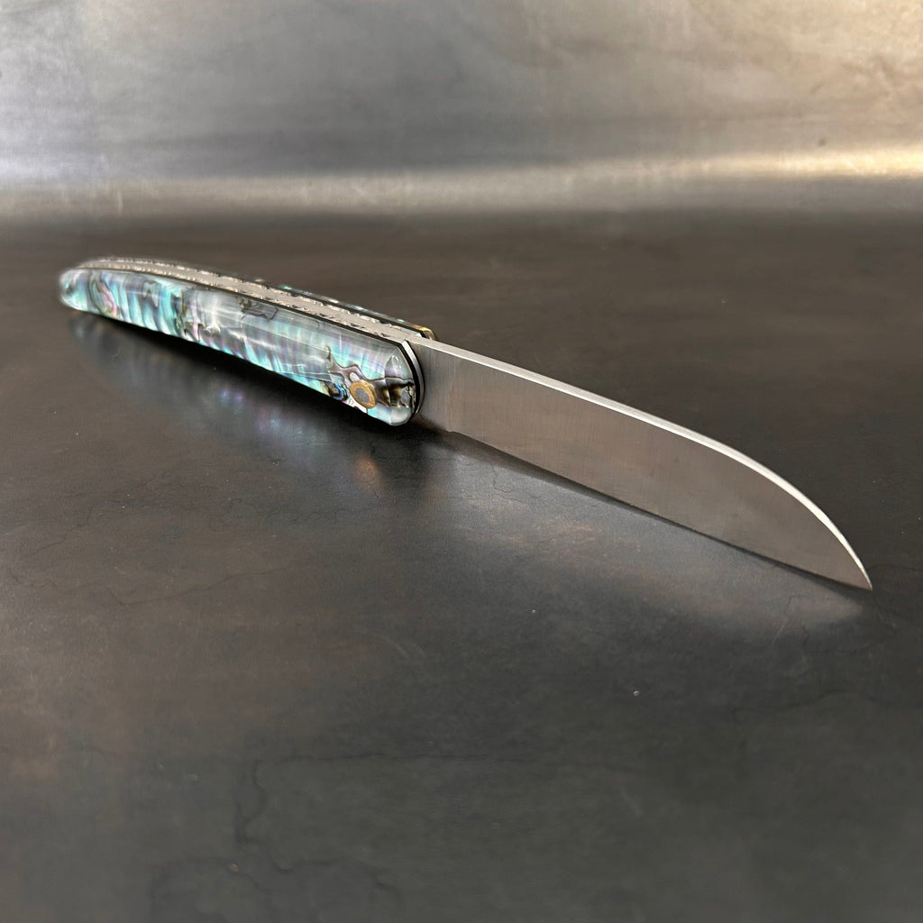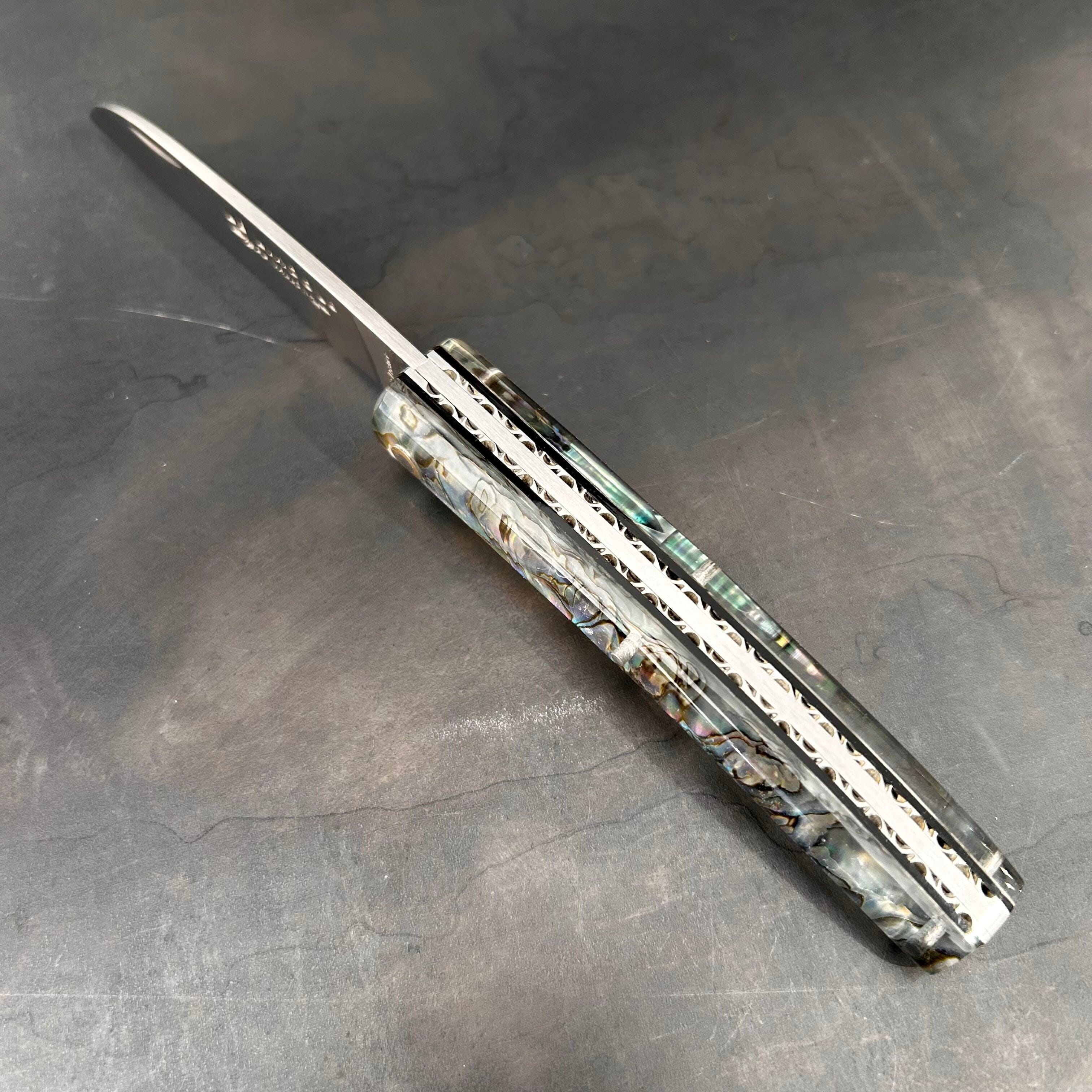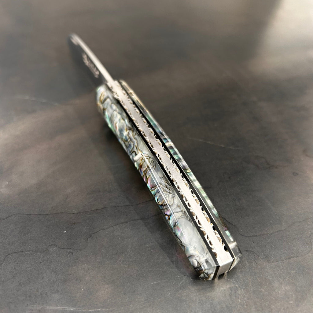 Ce couteau fermant est équipé d'un manche en Abalone & intercalaires noirs façonné à la main. Ses platines sont également ciselées à la main. Sa lame est en acier Sandvik 14C28 inoxydable présentant performance de coupe, dureté élevée et très bonne résistance à la corrosion.