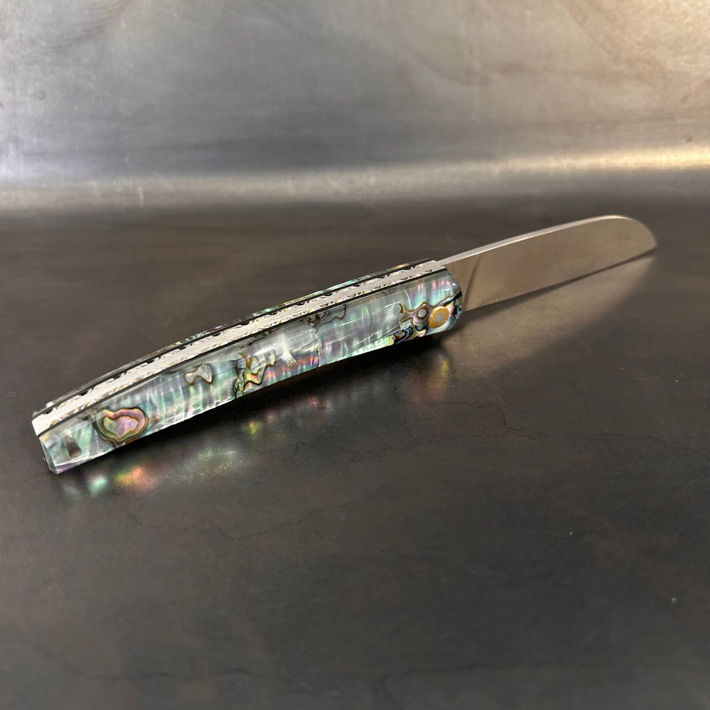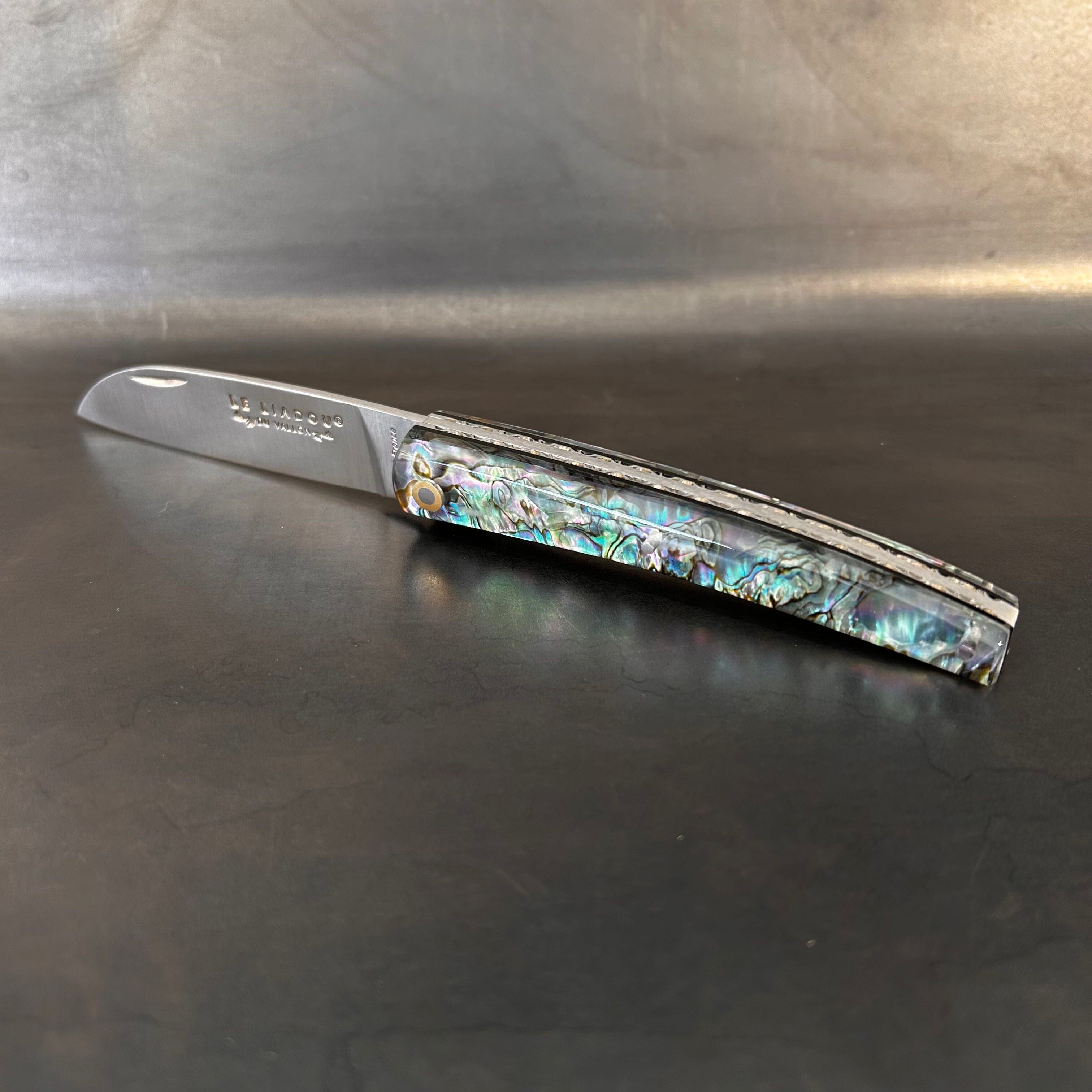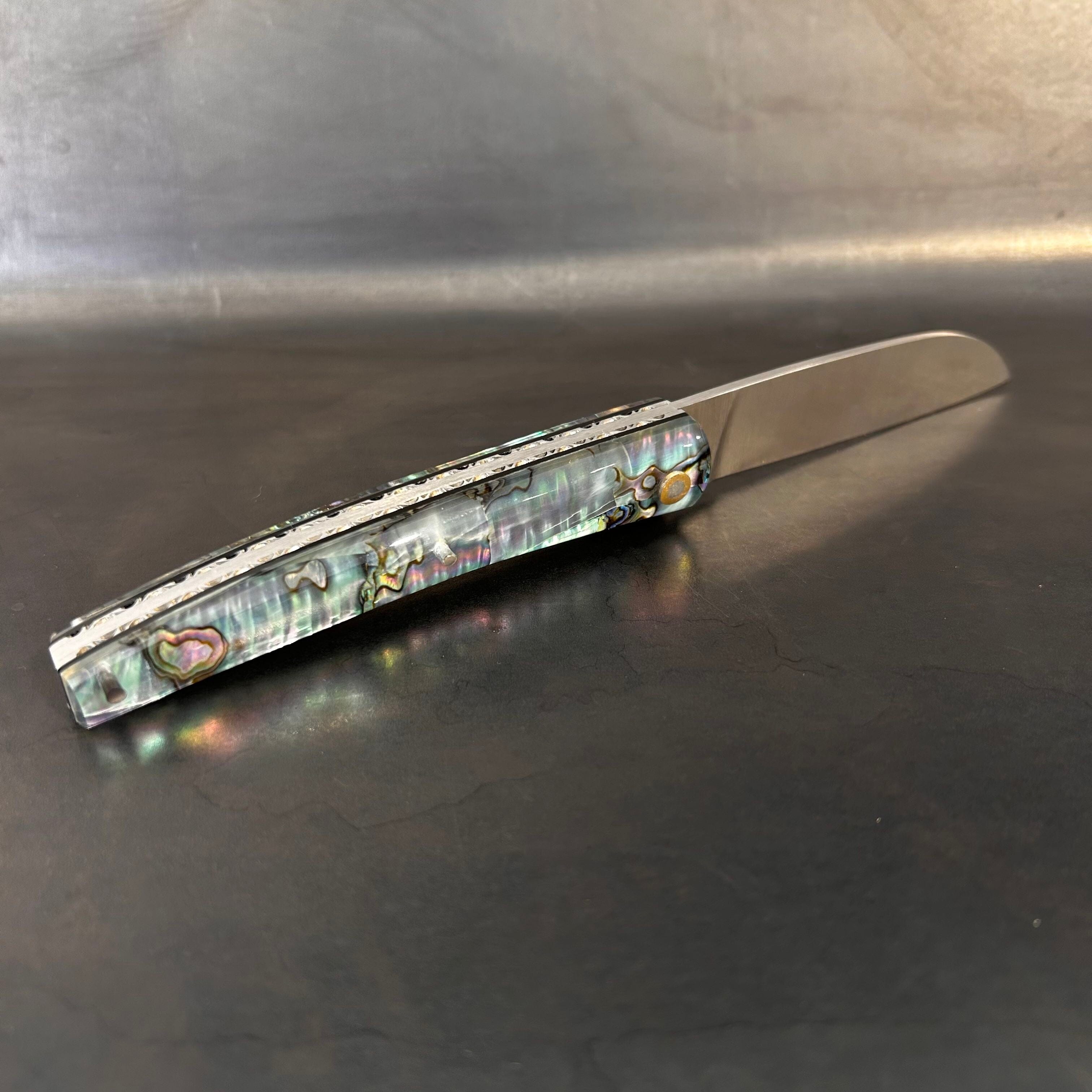 Ce couteau fermant est équipé d'un manche en Abalone & intercalaires noirs façonné à la main. Ses platines sont également ciselées à la main. Sa lame est en acier Sandvik 14C28 inoxydable présentant performance de coupe, dureté élevée et très bonne résistance à la corrosion.