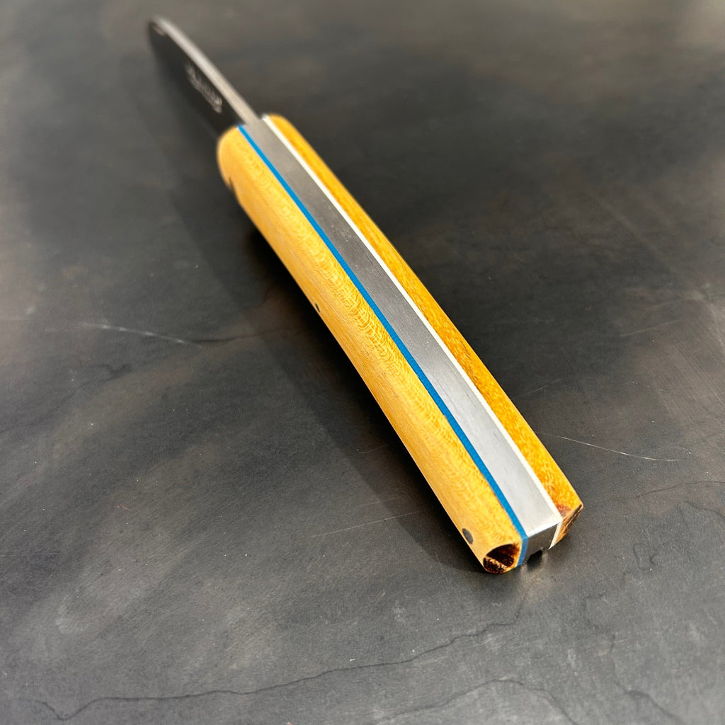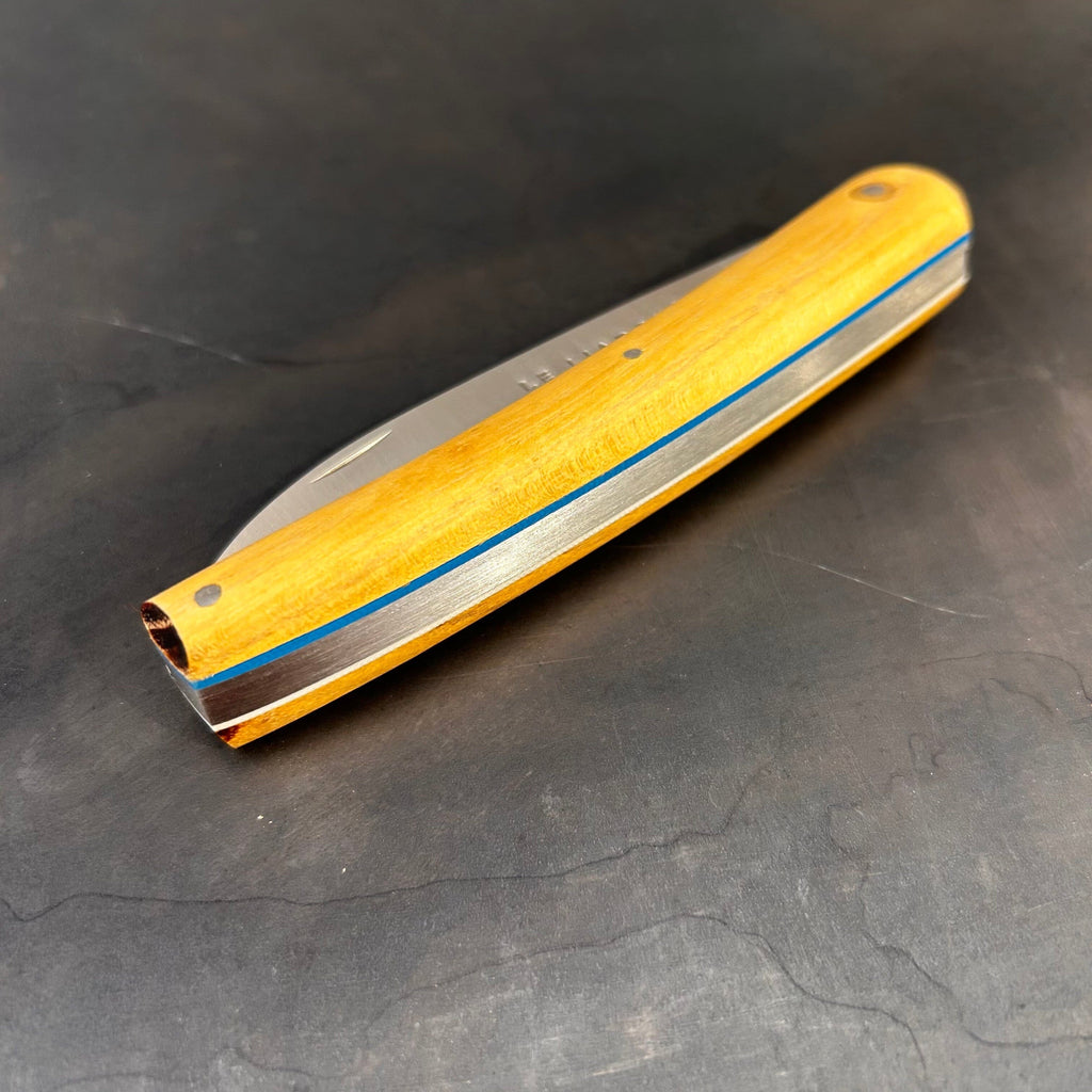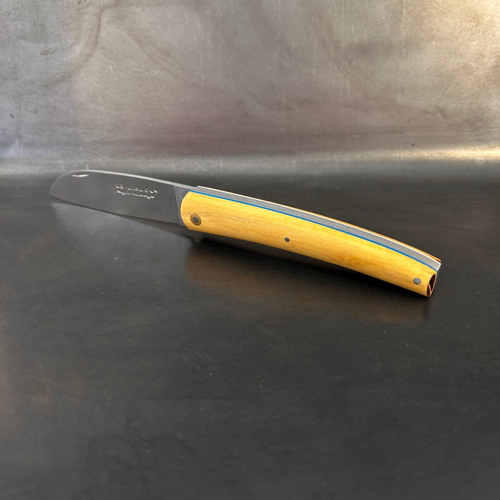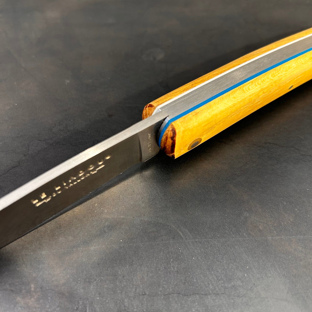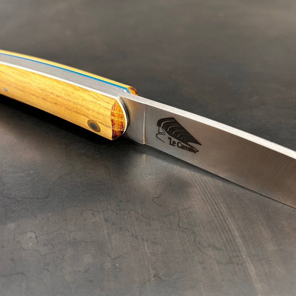 This exceptional limited edition is made from black locust wood sourced from the Vaysse forest. In the 19th century, this wood was used to produce pit props that supported the roofs of local mines. The handle, with its blue and white liners, proudly displays the colors of the Sporting Club Decazevillois.