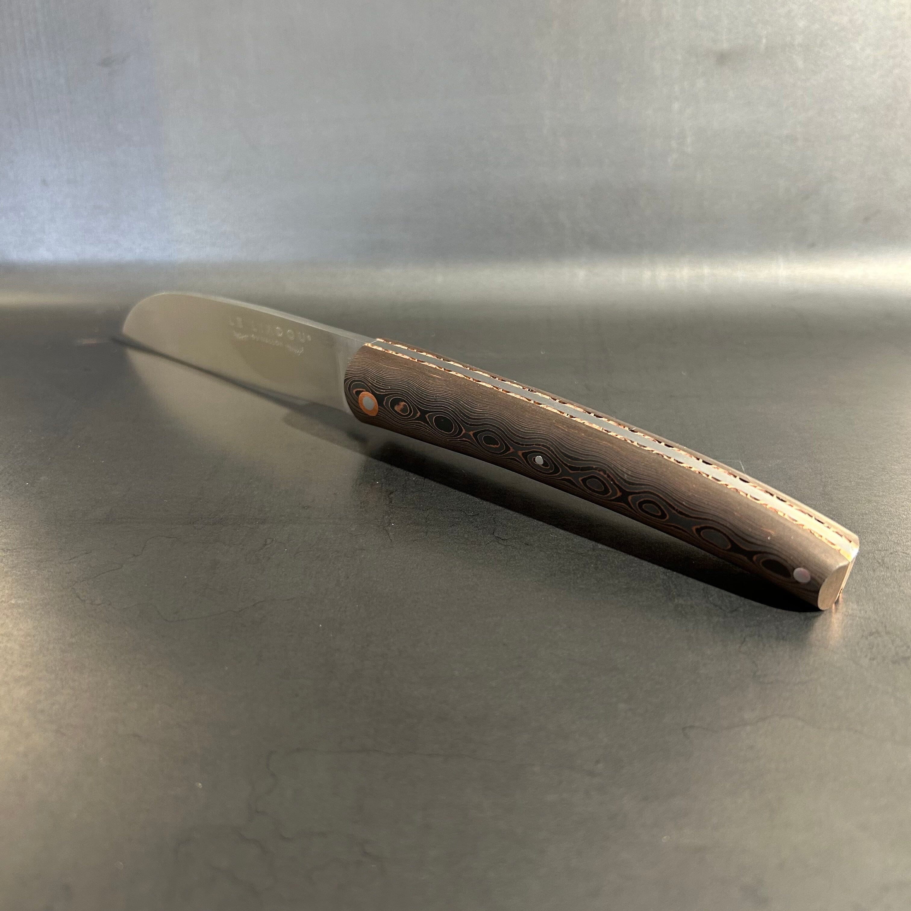 This knife is made with the greatest care. The handle materials are carefully selected from the most beautiful species or materials. It is handcrafted in the purest cutlery tradition. The blade is made from the highest performing steels and bears the registered trademark Le Liadou du Vallon ® guaranteeing the quality and origin of its products.