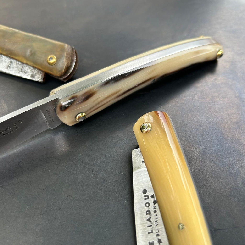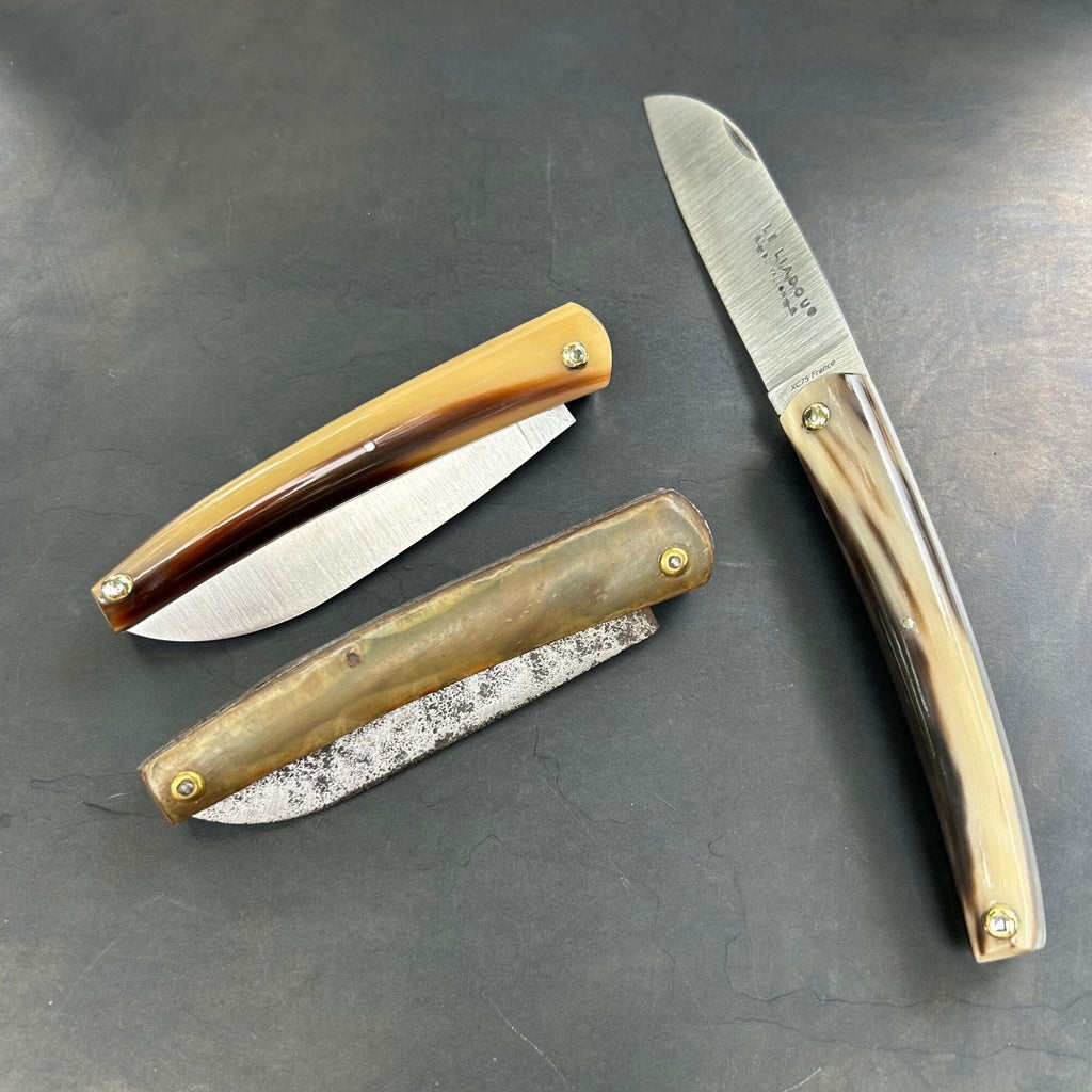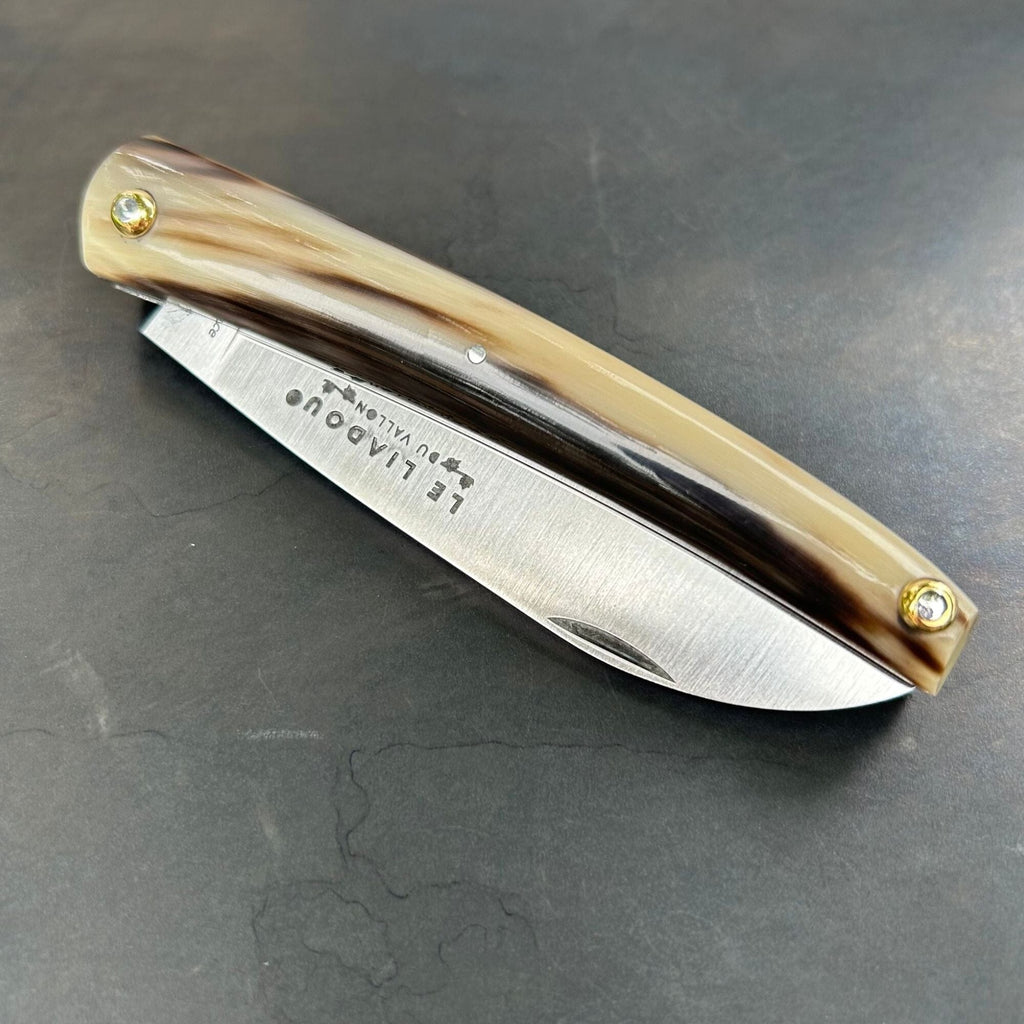 This new model is named the Liadou Marcillac. It features the same characteristics as the old Liadou but comes with a more refined, beautiful, and high-quality horn tip handle. Its double brass rosettes are hand-padded. The liners are made of stainless steel, and the blade is made of XC75 carbon steel or Sandvik 14C28.