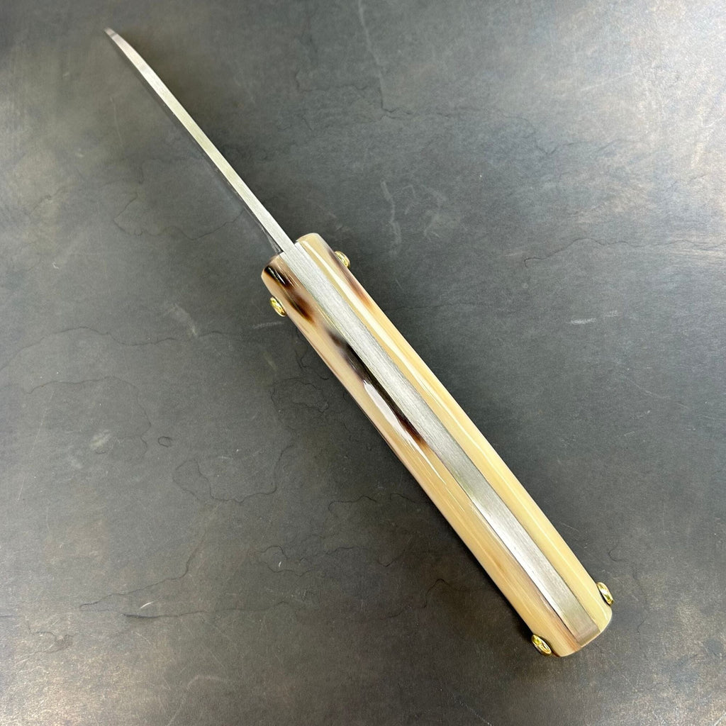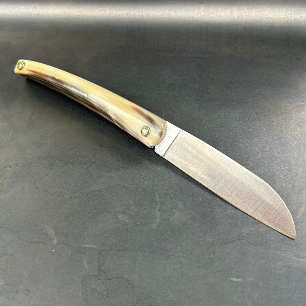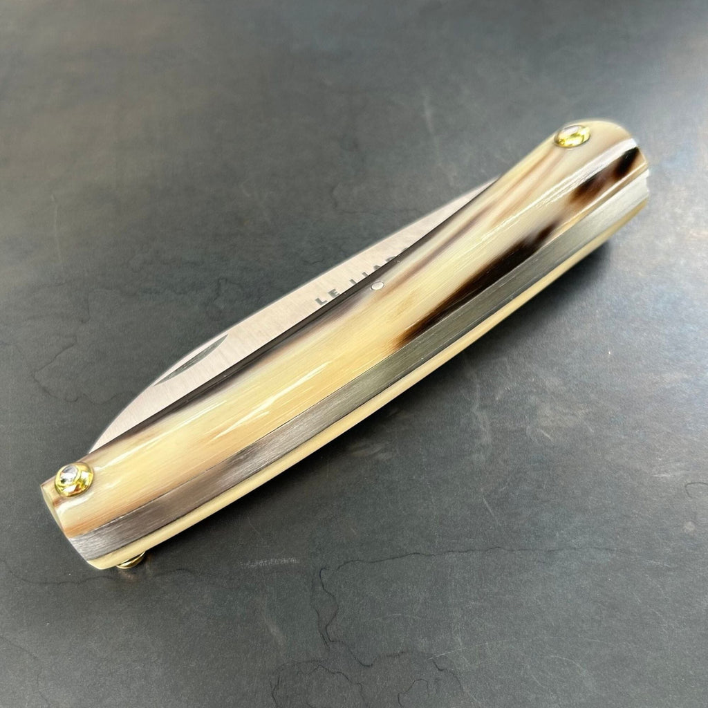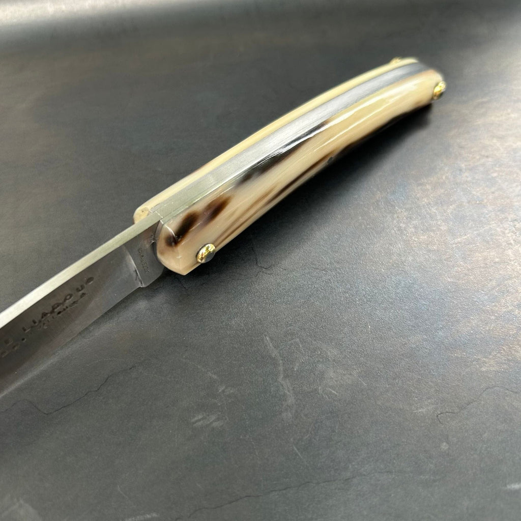 This new model is named the Liadou Marcillac. It features the same characteristics as the old Liadou but comes with a more refined, beautiful, and high-quality horn tip handle. Its double brass rosettes are hand-padded. The liners are made of stainless steel, and the blade is made of XC75 carbon steel or Sandvik 14C28.