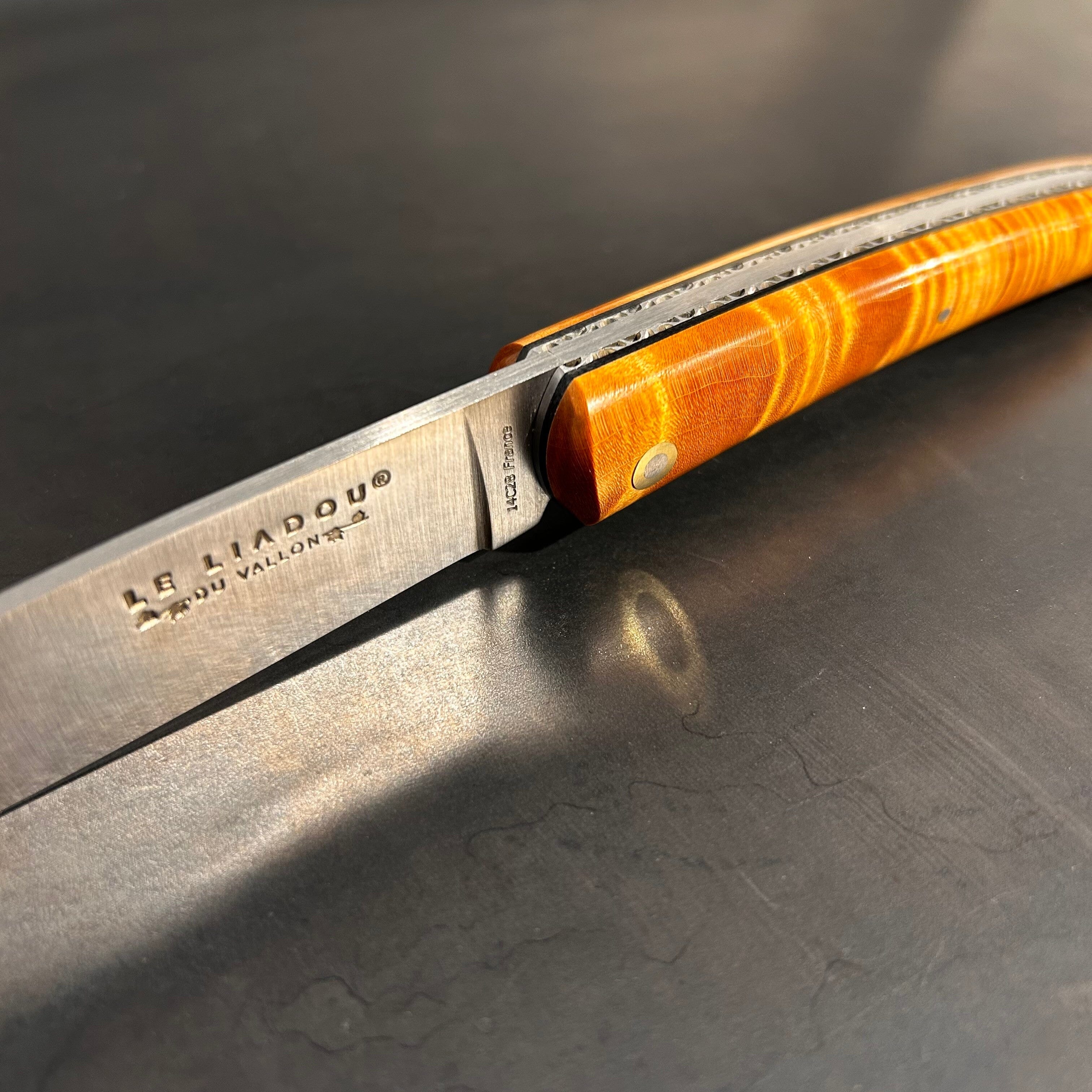 We take the greatest care in the manufacturing of our knives. The handle materials are carefully selected from the most beautiful species of precious wood, varieties of horns and other noble materials. Each knife is handcrafted in the purest cutlery tradition. The blade is made from the highest-performance steels and bears the registered trademark Le Liadou du Vallon ® guaranteeing the quality and origin of its products.