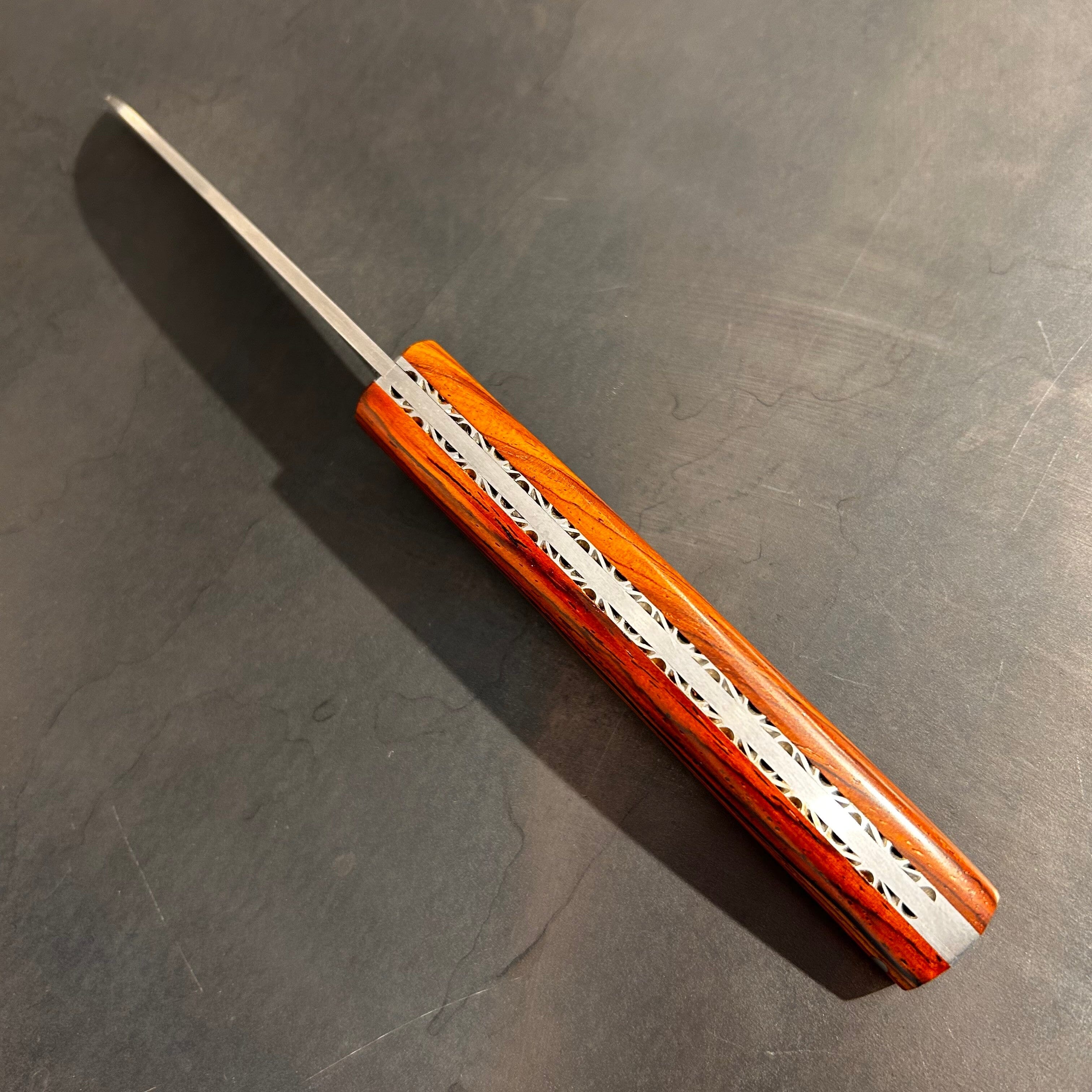 Ce couteau fermant est équipé d'un manche en Cocobolo façonné à la main. Ses platines sont également ciselées à la main. Sa lame est en acier Sandvik 14C28 inoxydable présentant performance de coupe, dureté élevée et très bonne résistance à la corrosion.