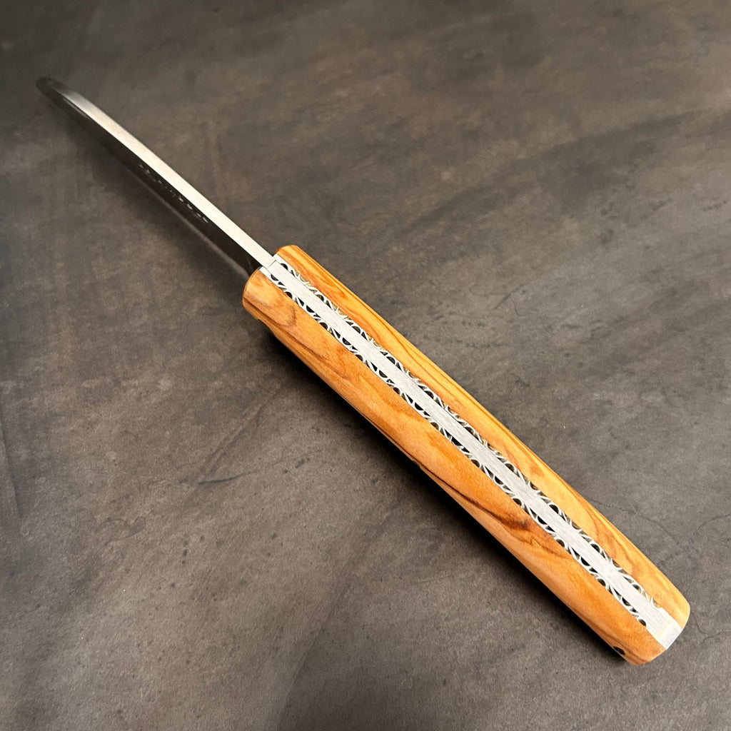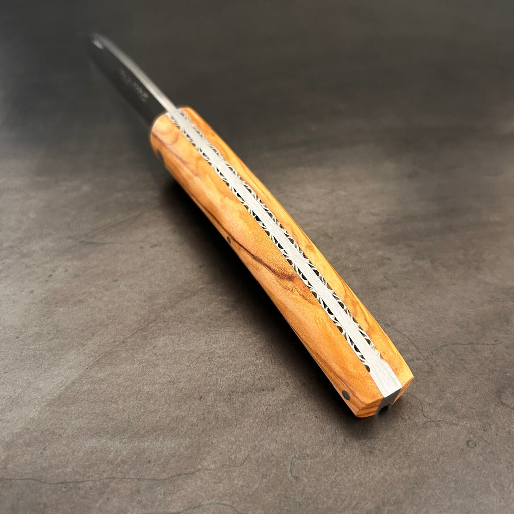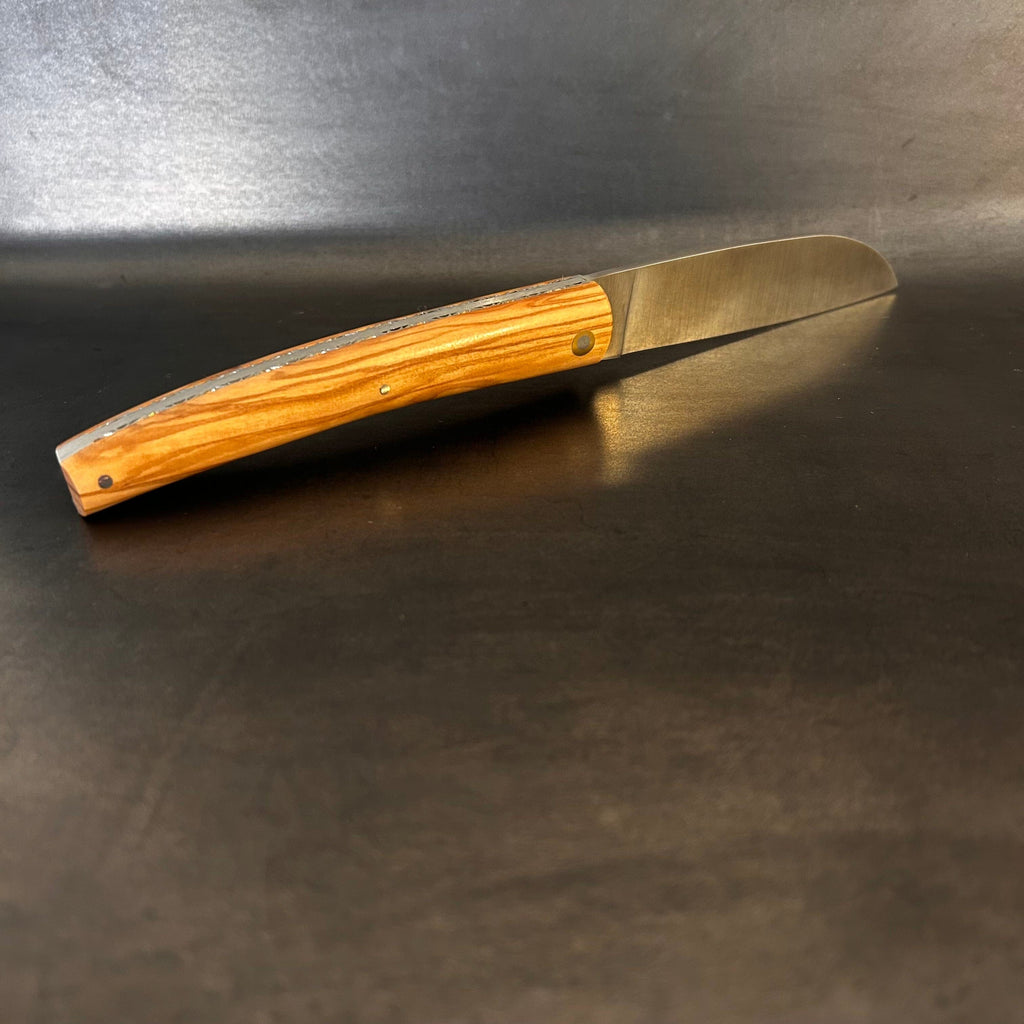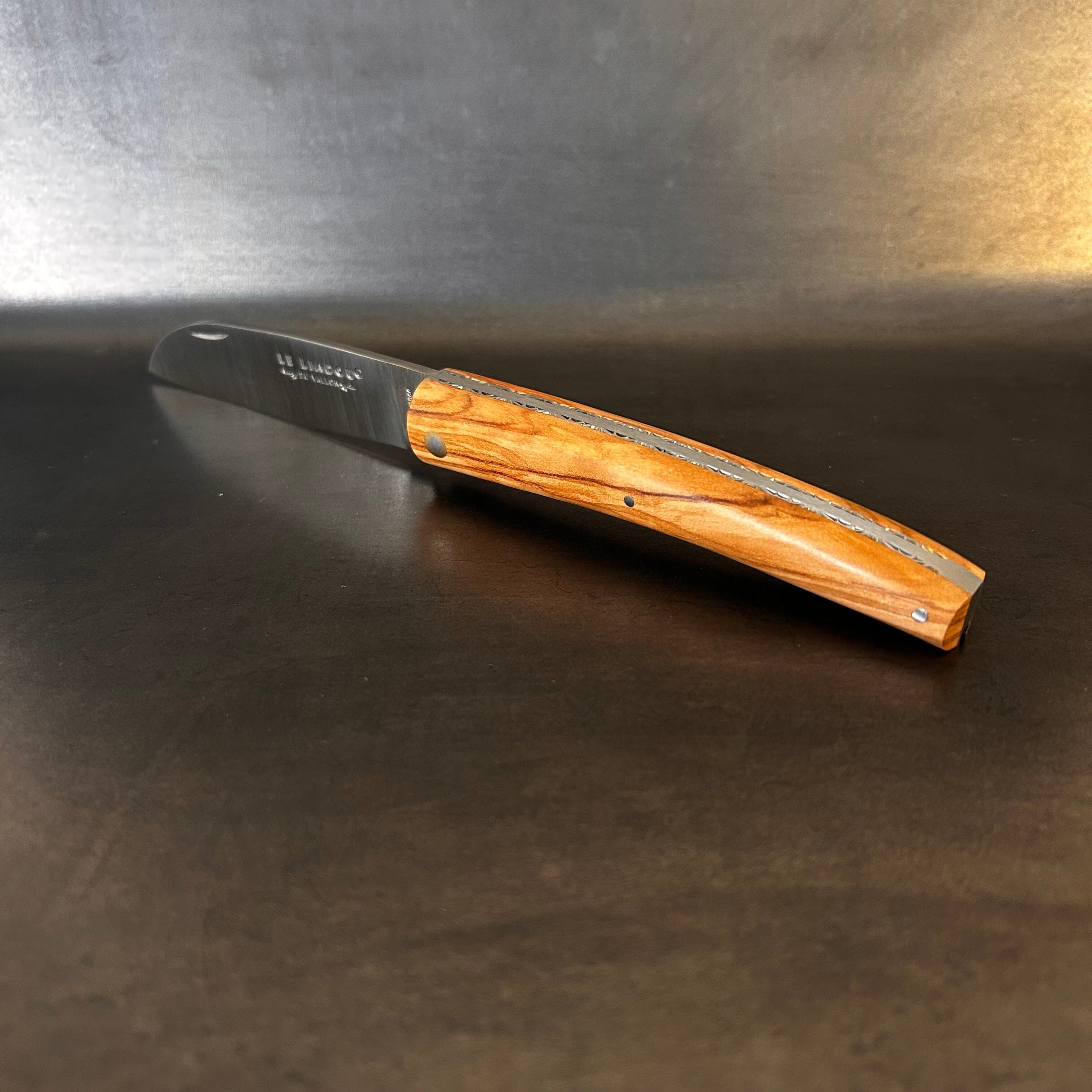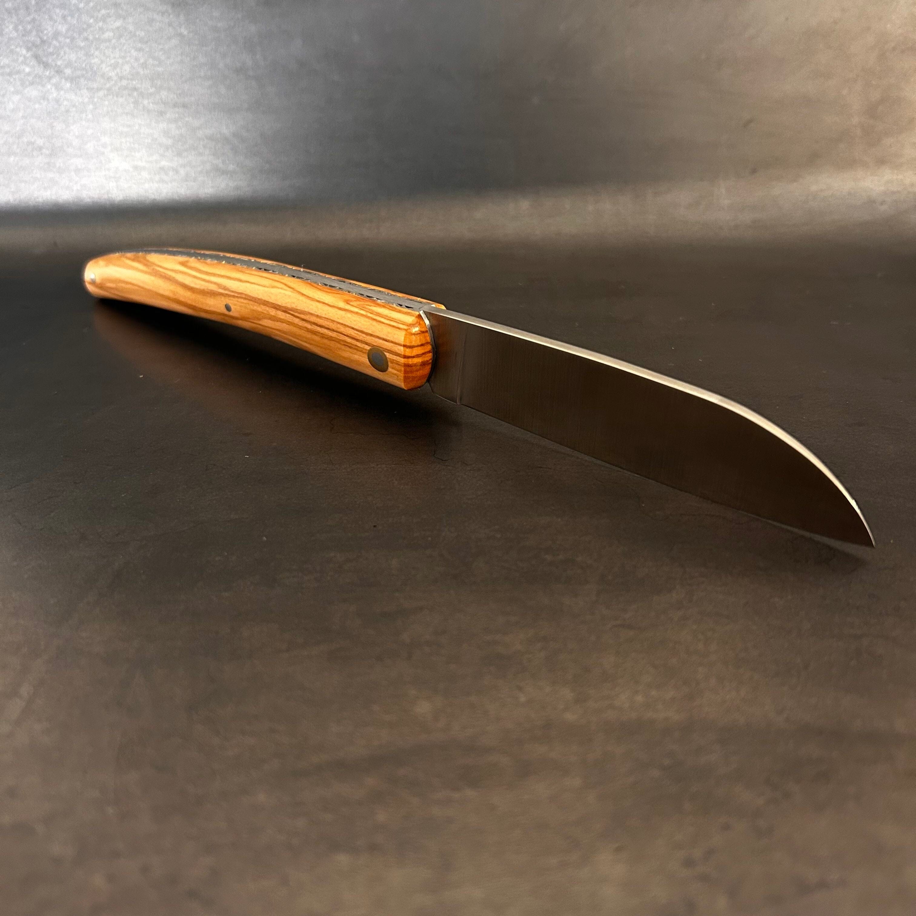 Ce couteau fermant est équipé d'un manche en olivier façonné à la main. Ce bois noble symbolise la longévité et l'espérance; issu d'un arbre au tronc tortueux, son veinage est incomparable. Ses platines sont ciselées à la main. Sa lame est en acier inoxydable Sandvik 14C28 qui combine d'excellentes performances de coupe, une dureté élevée et une très bonne résistance à la corrosion.